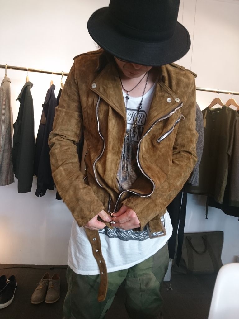 ふいに現れた金茶色のヌバックダブルライダース。